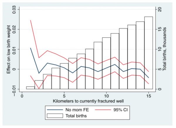 The chart clearly shows that the risk for low birth weight drops significantly in the 1-2 km bar (second from the left) and then sharply rises in the 2-3 km bar. There is no explanation as to why the data show mothers farther away from fracking sites have a higher risk than those who are closer.